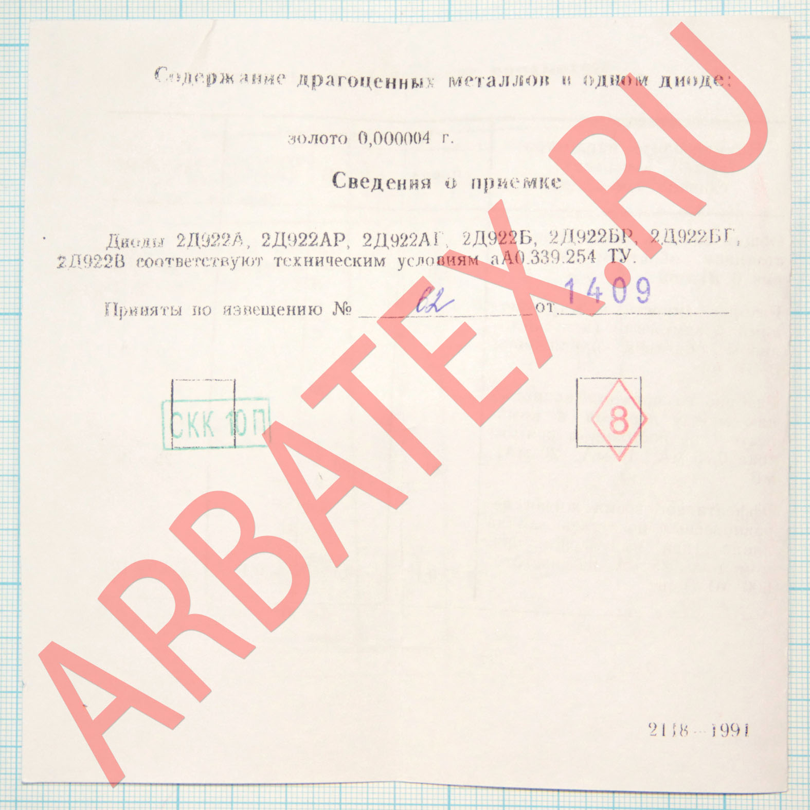 Подобранные в пары и четверки диоды (2Д922АР, 2Д922БР, 2Д922АГ, КД922БГ, КД922АР, КД922БР, КД922АГ, КД922БГ) имеют дополнительную упаковку внутри групповой тары.