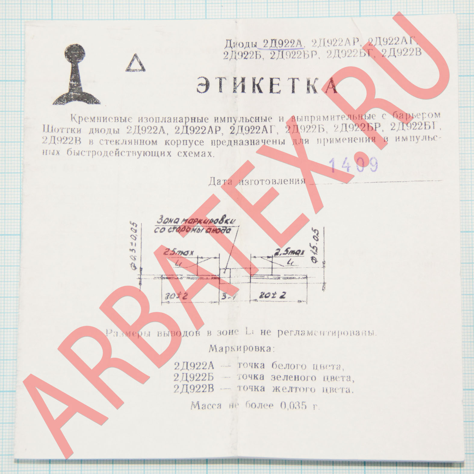 Масса диода не более 0,035 г.