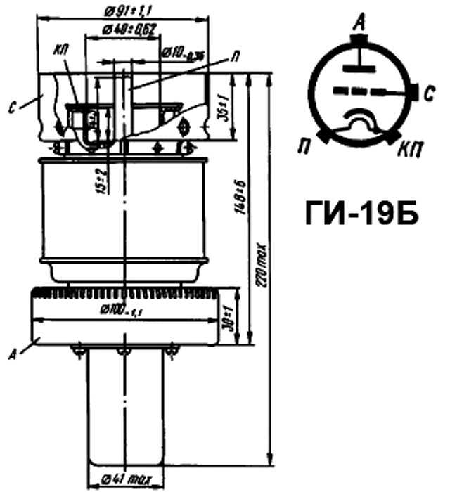 Мощный импульсный генераторный триод ГИ-19Б для работы в качестве генератора высокочастотных колебаний в схемах с общей сеткой, в режиме самовозбуждения при импульсной анодной модуляции в метровом диапазоне волн и длительности импульса 10 мкс.